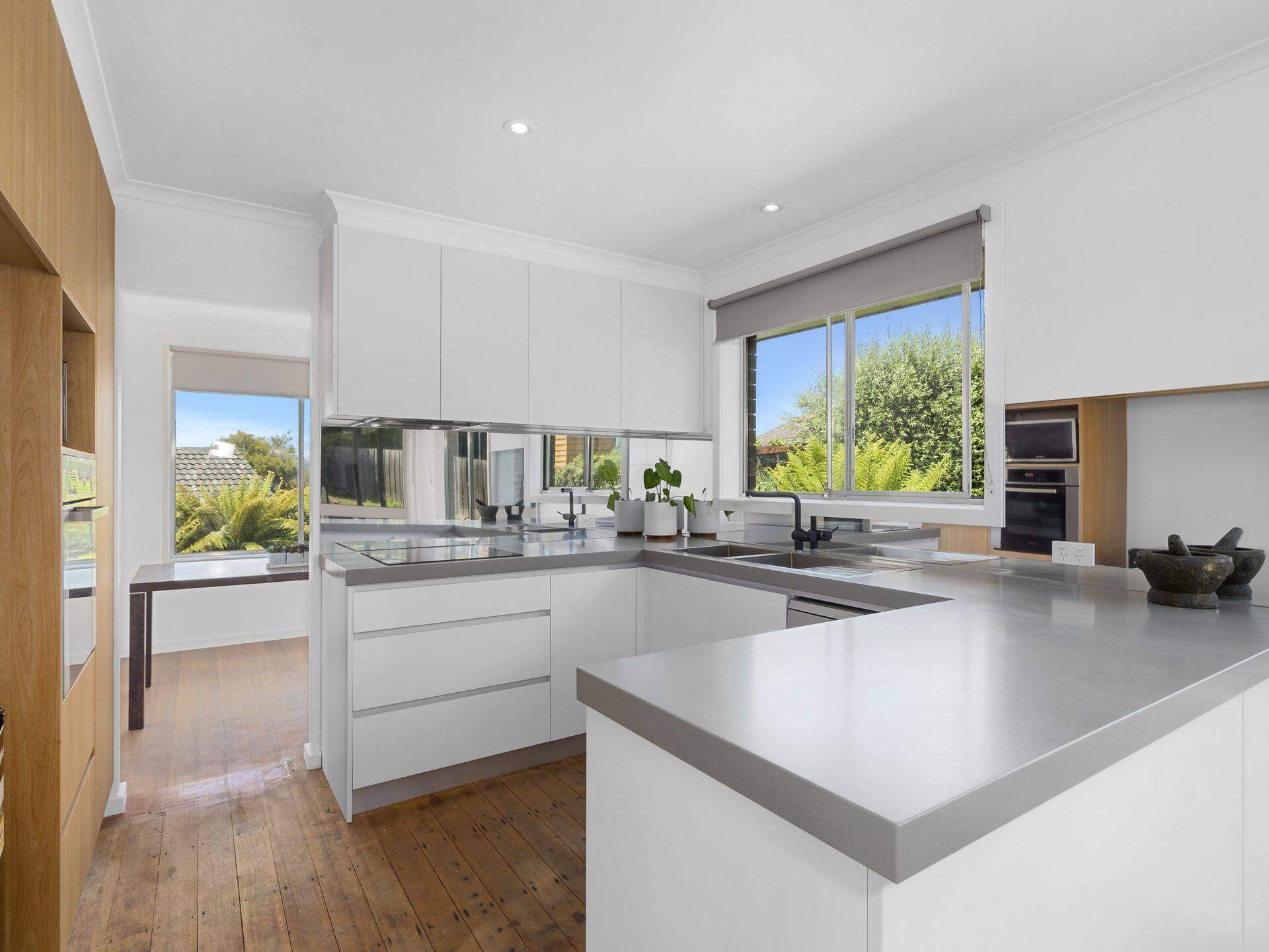 Các kiến trúc sư MoreHome thiết kế phòng bếp hiện đại dành cho căn hộ sáng tạo khi sử dụng hiệu ứng tương phản tăng độ rộng từ tủ bếp màu trắng và kính ốp bếp màu đen huyền bí.