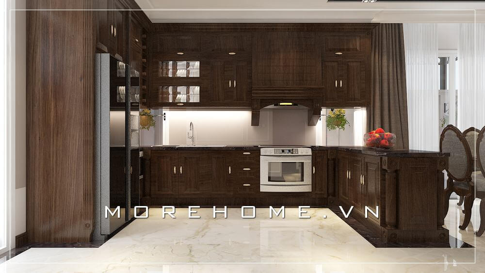 Mẫu tủ bếp gỗ tự nhiên với thiết kế chữ U tân cổ điển sang trọng, sử dụng tone màu nâu trầm tạo cảm giác ấm cúng, cao cấp và tiện nghi cho phòng bếp biệt thự