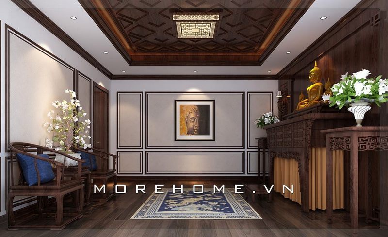 Trang trí phòng thờ phật cho biệt thự cao cấp sử dụng gỗ tự nhiên cho nội thất căn phòng tạo nên không gian phòng thờ sang trọng, cuốn hút mọi ánh nhìn