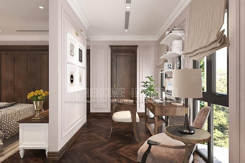 Thiết kế phòng ngủ có bàn làm việc nội thất sử dụng gỗ tự nhiên chủ yếu mang tới sự sang trọng, tính cách và gu thẩm mỹ của gia chủ