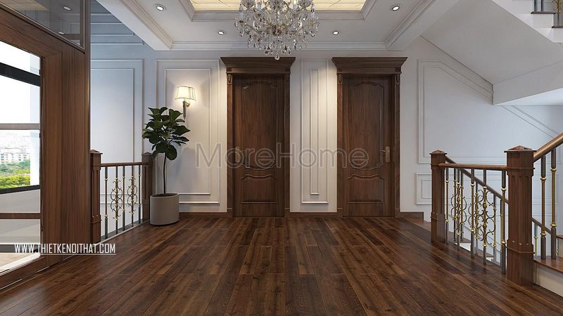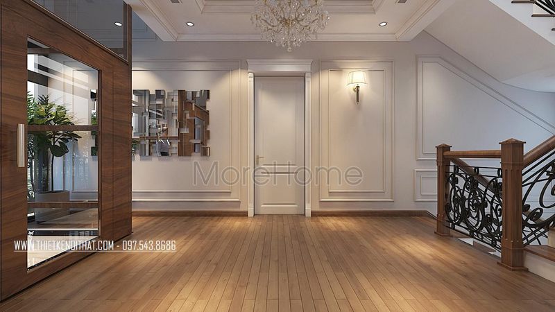 Thiết kế hành lang tầng không gian di chuyển đi lại điểm cầu kết nối giữa các không gian phòng với nhau và cũng thể hiện sự phong thủy đem tới tài lộc, may mắn cho gia chủ