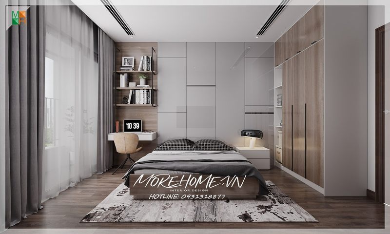 Mẫu thiết kế nội thất phòng ngủ chung cư đơn giản, hiện đại, chiếc bàn làm việc được kê sát giường ngủ mang đến sự thoải mái và tiện dụng hơn cho gia chủ