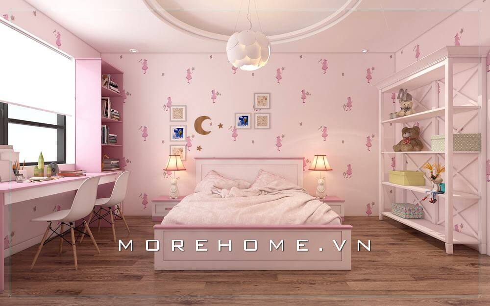 Thiết kế nội thất phòng ngủ bé gái ấn tượng với gam màu hồng phấn đáng yêu, chắc hẳn con bạn sẽ cảm thấy vô cùng yêu thích một không giang phòng ngủ như thế này đấy